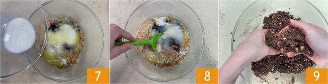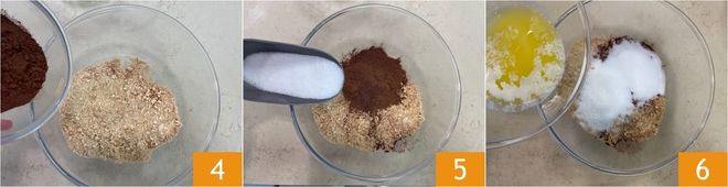 Mientras tanto, añade en el bol con las galletas el cacao amargo 4 y el azúcar 5, luego vierte la mantequilla derretida y templada 6.