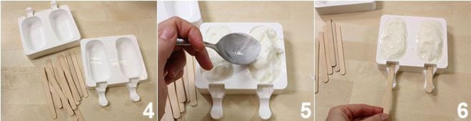 Ahora prepara todo lo necesario para hacer tu pingüino: necesitarás moldes de silicona y palitos de helado 4. Llena los moldes con el helado 5, nivela bien y golpea un poco el molde para evitar que se formen burbujas y finalmente inserta los palitos 6. Deja que los helados se solidifiquen durante toda la noche en el congelador.