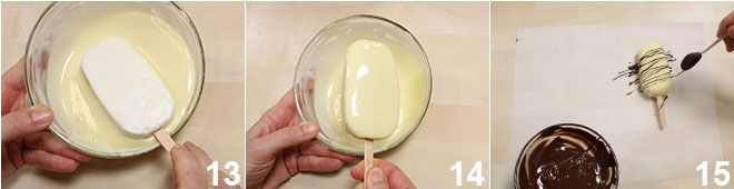 Los otros 3 sumérgelos en el chocolate blanco, siempre sellando bien el fondo (13-14). Pon tus pingüinos inmediatamente en el congelador sobre una hoja de papel de horno durante al menos una hora. Una vez fríos, podrás decorarlos con el chocolate negro sobrante. ¡Y aquí está el helado pingüino listo para ser disfrutado!