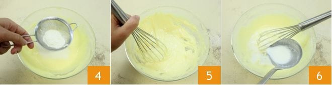 Luego añade la harina tamizándola con un colador 4 y mezcla nuevamente con el batidor para integrar los ingredientes 5. En este punto, cuando la leche esté caliente, apaga el fuego y viértela en hilo sobre la mezcla de huevos, azúcar y harina ayudándote con un cucharón 6. Añádela poco a poco, continuando a mezclar con el batidor para que no se formen grumos.