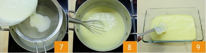 Filtra la crema obtenida y viértela en la cacerola donde habías calentado la leche 7; cocina la crema a fuego lento, mezclando continuamente con un batidor 8 hasta que llegue a una ligera ebullición. La crema estará lista cuando se vuelva más espesa hasta cubrir una cuchara de madera. Luego apaga el fuego y transfiere la crema obtenida a un recipiente grande 9. Cubre con film de plástico en contacto y deja aparte a temperatura ambiente para que se enfríe.