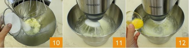 Mientras la crema se enfría, pasa a preparar la masa. En el bol de una batidora, coloca la mantequilla en trozos a temperatura ambiente, vierte el azúcar granulada 10 y comienza a batir 11; con las varillas siempre en funcionamiento añade la yema 12.