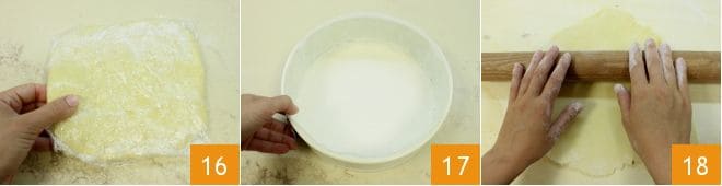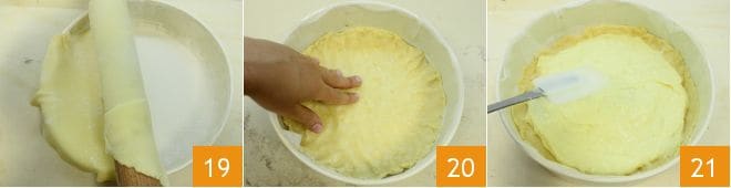 Ayudándote con el rodillo, desenrolla sobre el molde el disco de masa 19 y con las manos haz que la masa se adhiera perfectamente al fondo 20 y a los bordes. Luego, toma la crema que se habrá enfriado y viértela en el molde ayudándote con una espátula para extenderla de manera uniforme sobre toda la superficie 21.