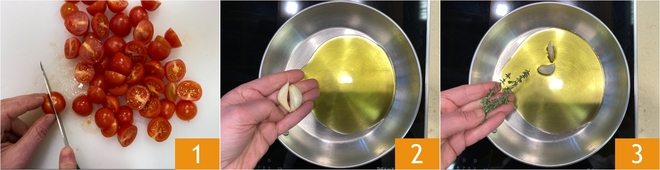 Para preparar la pinsa con jamón serrano, tomates cherry y mozzarella, lo primero es cortad los tomates cherry por la mitad 1. En una sartén calentad el aceite con el ajo 2 y el tomillo 3.