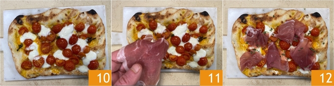 Sacadla del horno 10 y colocad encima las lonchas de jamón serrano 11. Adornad con alguna hojita de tomillo y servid inmediatamente vuestra pinsa con jamón serrano, tomates cherry y mozzarella 12!