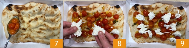 Ahora tomad la base para pinsa y repartid los tomates cherry por la superficie 7, luego añadid la mozzarella desmenuzándola con las manos 8. Hornead en horno ventilado precalentado a 250° durante 5 minutos 9.