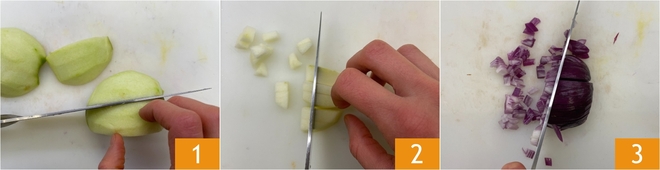 Para preparar la pinsa con mortadela y burrata, para empezar pelad las manzanas y cortadlas primero en gajos 1, luego en láminas y finalmente en cubitos de aproximadamente 0,5 cm 2. Limpiad y picad la cebolla roja 3.
