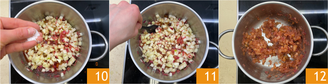 Sazonad con sal 10, mezclad bien 11 y proseguid la cocción a fuego medio-bajo durante aproximadamente una hora. El chutney deberá deshacerse y reducirse 12. Dejad templar.