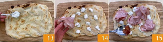 Ahora calentad la base para pinsa en el horno ventilado precalentado a 250° durante 5 minutos, luego sacadla del horno y condimentadla con porciones de burrata 13. Colocad la mortadela en lonchas 14 y repartid el chutney 15.