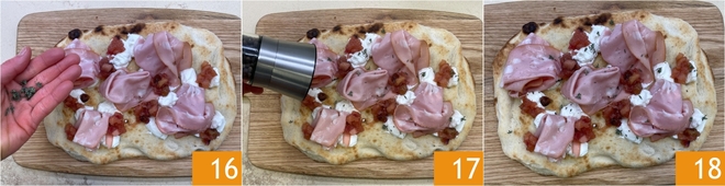 Por último decorad con tomillo 16 y pimienta negra 17. ¡Vuestra pinsa con mortadela y burrata está lista para disfrutarla 18!