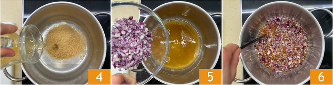 En una cazuela verted el azúcar moreno y el vinagre de manzana 4, luego añadid la cebolla 5 y coced a fuego medio hasta que el azúcar esté disuelto 6.