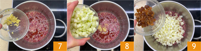 A continuación añadid el jengibre rallado 7, las manzanas en cubitos 8 y las pasas 9.