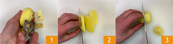 Para preparar la pinsa con salchicha y patatas, comenzad por las patatas: peladlas 1 y cortadlas primero en rodajas 2 y luego en cubos de aproximadamente 1,5 cm 3.<\/p>