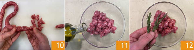 Mientras tanto, ocupáos de la salchicha: eliminad la tripa y desmenuzadla con las manos para obtener trozos grandes de un par de cm 10. Transferid la salchicha a un bol y sazonad con aceite 11 y romero 12.<\/p>