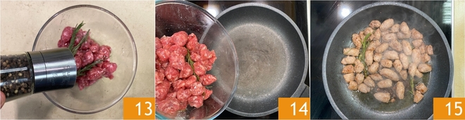 Salad ligeramente, añadid pimienta 13 y mezclad bien. Calentad bien una sartén antiadherente, luego añadid la salchicha 14 y doradla durante unos 5 minutos, luego reservad 15.<\/p>