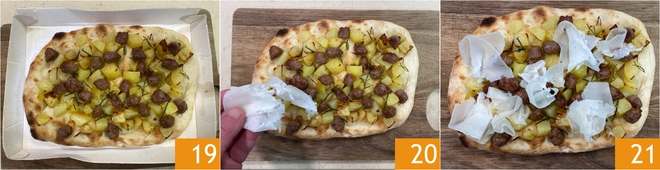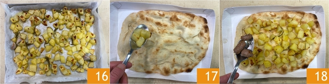 Transcurrido el tiempo de cocción, sacad las patatas del horno 16. En este punto, tomad las bases para pinsa y distribuid las patatas asadas sobre la superficie 17, luego añadid también la salchicha dorada 18.<\/p>