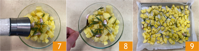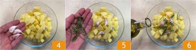 Recoged los cubos de patatas en un bol, luego sazonad con los dientes de ajo sin pelar 4, las agujas de romero 5 y el aceite 6.<\/p>
