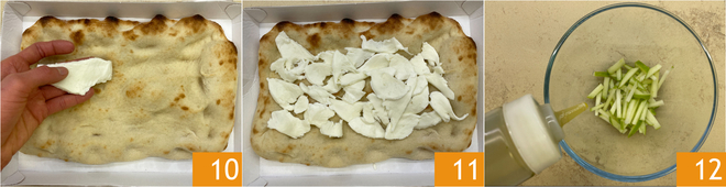 Ahora colocad las lonchas de mozzarella sobre la base para pinsa 10 y horneadla 5 minutos en horno ventilado precalentado a 250°, situándola en la bandeja baja 11. Entretanto, escurrid las manzanas y aliñadlas con un chorrito de aceite 12.