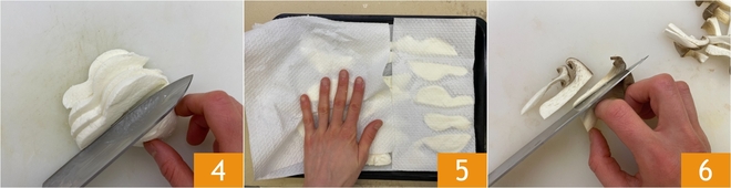 Cortad la mozzarella en lonchas de 3 mm de grosor 4, colocadlas en una bandeja y secadlas bien con papel absorbente 5. Reservadlas y cortad los hongos cardoncelli en láminas 6.