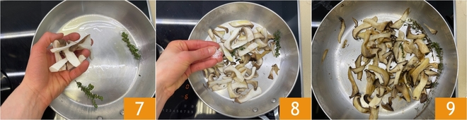En una sartén calentad un chorrito de aceite con unas ramitas de tomillo limonero, luego añadid los cardoncelli 7 y salad 8. Saltead los hongos a fuego medio durante 5-6 minutos 9.