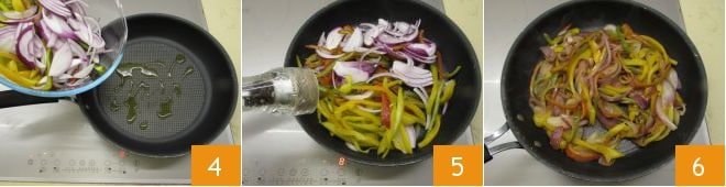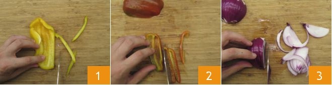 Para preparar la pita con pollo frito, primero lava los pimientos, luego córtalos por la mitad, extrae las semillas internas y luego córtalos en tiras finas 1 2. Limpia y corta también la cebolla roja 3.
