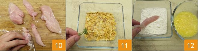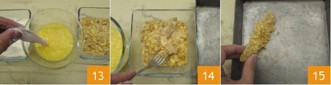 Toma el pollo y córtalo en bastones 10. Prepara el empanado: en un bol, vierte los corn flakes y el pan rallado, aromatiza con el orégano 11 y en otros dos vierte respectivamente los huevos batidos y la harina. Ahora toma un trocito de pollo y pásalo primero por la harina 12.