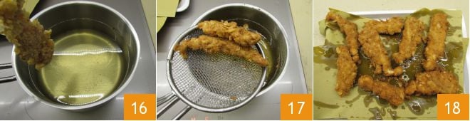 Calienta el aceite para freír y cuando haya alcanzado los 170° (medido con un termómetro de cocina) sumerge los trocitos 16. Cocina durante unos 3 minutos. Tan pronto como el pollo esté dorado, escúrrelo con una espumadera 17 y colócalo en una bandeja forrada con papel absorbente para secar el exceso de aceite 18.