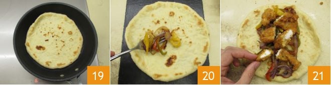 Ahora calienta la pita en una sartén durante unos minutos 19. Aún caliente, rellénala con las verduras salteadas 20 y el pollo frito cortado en trozos 21.