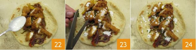 Sazona con la salsa de yogur 22 y cebollino cortado en rodajas 23. La Pita con pollo frito está lista 24, ¡dobla por la mitad y disfrútala caliente!