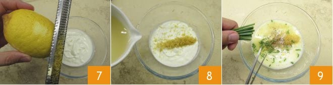 Mientras tanto, prepara la salsa: en un bol, vierte el yogur, aromatiza con la ralladura de limón 7 y su jugo 8, finalmente añade el cebollino picado en trocitos 9.