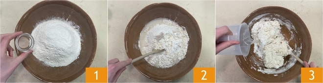 Para preparar la pizza alla Nerano con borde relleno, una en un bol la harina y la levadura deshidratada 1. Vierta el agua a temperatura ambiente poco a poco, mezclando con una cuchara 2, hasta que la harina haya absorbido todo el líquido 3.