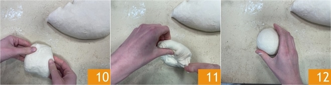 Forme bolas de masa: estire ligeramente la masa 10, doble hacia el centro 11 y gire 12.