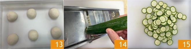 Coloque las bolas de masa en una bandeja cubierta con papel de horno 13 y deje que fermenten durante aproximadamente una hora a temperatura ambiente, cubiertas con film transparente. Luego transfiera la bandeja al frigorífico durante una noche (unas 8-10 horas). Dedíquese a los calabacines alla Nerano: lave y quite los extremos de los calabacines, luego córtelos con una mandolina 14 para obtener rodajas finas 15.