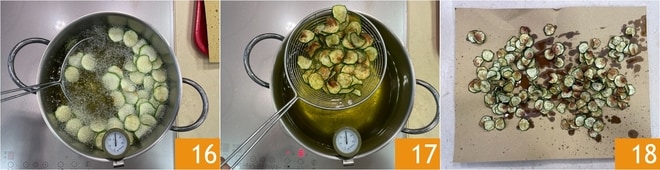 Fría los calabacines en aceite de semillas a una temperatura de unos 160°, pocos a la vez y durante poco tiempo 16; deben dorarse apenas 17. Escurra los calabacines fritos en una bandeja cubierta con papel de cocina para absorber el exceso de aceite 18.