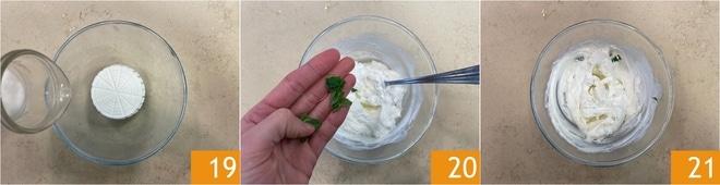 Escurra bien la ricotta y colóquela en un bol con la leche 19. Mezcle y aromatice con hojas de menta fresca 20. Reserve esta crema que servirá para rellenar el borde 21.
