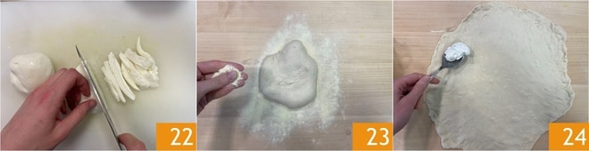 Escurra bien la mozzarella fiordilatte y córtela en bastones 22. Pasado el tiempo de fermentación, recupere las bolas de masa y déjelas a temperatura ambiente durante 30 minutos. Luego trabaje cada una de ellas sobre la superficie enharinada 23. Estire la masa con las manos para crear un disco de unos 30 cm, asegurándose de que el centro sea más grueso que el borde. Distribuya la crema de ricotta en el borde 24.