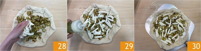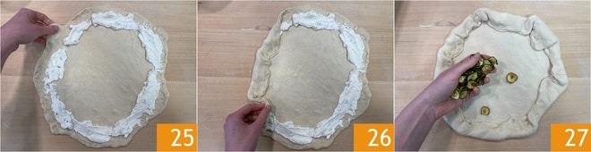 Doble los bordes exteriores hacia adentro 25 para cubrir el relleno y formar el borde a lo largo de toda la circunferencia 26. Distribuya en el centro los calabacines fritos 27.