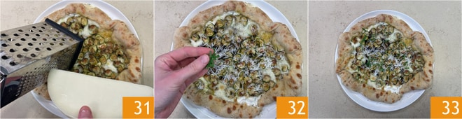 Sáquela del horno y agregue inmediatamente el provolone del Monaco rallado 31, luego decore con la menta fresca 32. Proceda de la misma manera para cocinar todas las pizzas. ¡Su pizza alla Nerano con borde relleno está lista para ser disfrutada 33!
