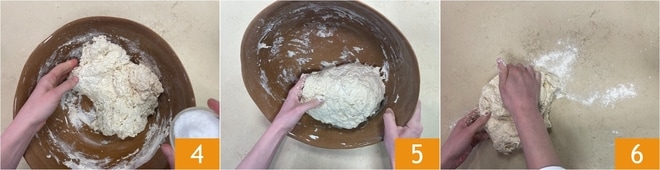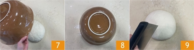 Forme una masa, cúbrala con el bol 7 y deje reposar al menos 5 minutos sobre la superficie de trabajo 8. Pasado este tiempo, con un cortador, saque 6 masas de unos 280 g cada una 9.