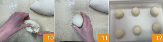 Formar bolas de masa: extender ligeramente la bola 10, doblar la masa hacia el centro 11 y bolear. Colocar las bolas de masa en una bandeja forrada con papel de horno 12 y dejar que levanten durante aproximadamente una hora a temperatura ambiente, cubiertas con film transparente. Luego, trasladar la bandeja al frigorífico durante una noche (unas 8-10 horas).