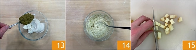 Encargarse del relleno del borde: en un bol unir la ricotta de búfala y el pesto de albahaca 13, mezclar para amalgamar 14. Cortar la provola en cubos 15.