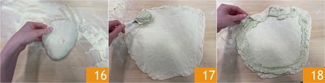 Pasado el tiempo de fermentación, tomar las bolas de masa y dejarlas a temperatura ambiente durante 30 minutos. Luego trabajarlas una a una sobre la mesa enharinada 16. Extender la bola de masa con las manos para crear un disco de unos 30 cm, asegurándose de que el centro sea más grueso que el borde. Distribuir en el borde la crema de pesto y ricotta 17. Doblar los bordes exteriores hacia adentro 18 para cubrir el relleno y formar el borde a lo largo de toda la circunferencia.