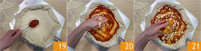Distribuir en el centro la salsa de tomate 19, la provola en cubitos 20 y los tomatitos cherry amarillos y rojos 21.