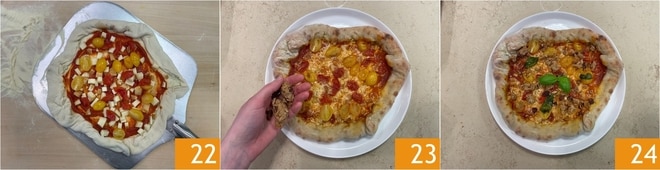 Condimentar con un chorrito de aceite y pimienta al gusto. Colocar en el horno la piedra refractaria y precalentarlo en modo estático a la máxima temperatura (250°-300°). Hornear la pizza 22 y cocinar durante unos 6-7 minutos. Sacar del horno y completar con los taralli napolitanos desmenuzados y hojas de albahaca fresca. La pizza con borde relleno de pesto y ricotta está lista para ser servida 24.