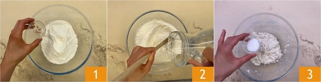 Para preparar la pizza con crema de trufa y jamón cocido, comenzad con la masa. En un bol grande, unid la levadura fresca con la harina 1. Verted el agua poco a poco 2 y en este punto incorporad la sal 3.