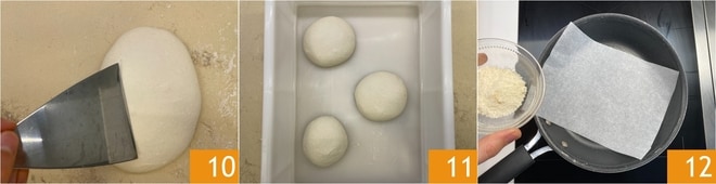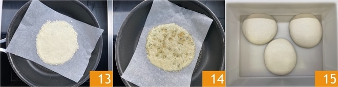 Pasado este tiempo, con la ayuda de una rasqueta, dividid la masa en 6 piezas de unos 260 g 10. Dejad fermentar los panecillos a una temperatura entre 18° y 24°C durante 8/12 horas en una caja para masas 11. Mientras tanto, podéis preparar las obleas de Grana Padano. Colocad en una sartén el papel de horno y verted el Grana al centro 12.