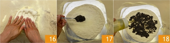 Con delicadeza, coged cada pieza de masa y estiradla con la ayuda de una pizca de harina 16. En la pala para pizza, extendéd el disco de masa y condimentadlo con la crema de trufa 17 y un chorro de aceite de oliva virgen extra 18.