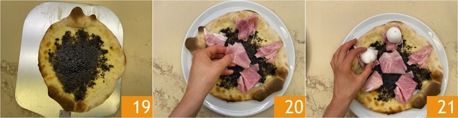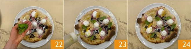 Coced la pizza en horno precalentado a 250° (o a la máxima temperatura disponible) durante unos 5-7 minutos en modo estático 19. Sacad del horno y añadid las lonchas de jamón 20 y las bolitas de mozzarella de búfala 21.