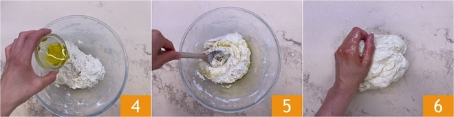 Incorporad también el aceite de oliva virgen extra 4 y el azúcar, luego mezclad primero con una cuchara 5, después comenzad a amasar con las manos 6.