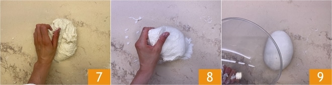 Al principio, la masa será rústica y pegajosa 7, pero después de trabajarla sobre la superficie de trabajo, se volverá cada vez más lisa y homogénea 8. En cuanto la masa esté lisa, dejadla reposar bajo un bol o un paño durante unos 30 minutos 9.